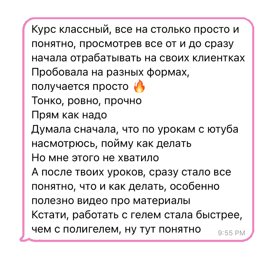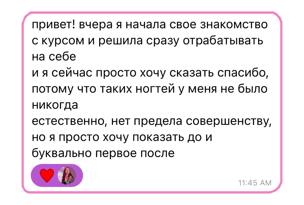 мой талант – просто и понятно говорить о сложных вещах, что гарантирует отличный результат уже после первой отработки. Мой курс способен избавить тебя от постоянных переделок сломанных ногтей у клиентов, так как укрепляя в моей технике, сломать ноготь невозможно.